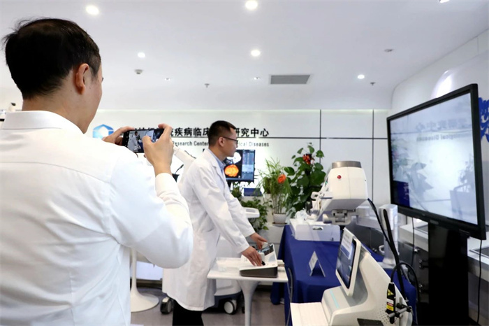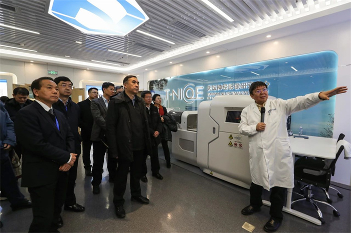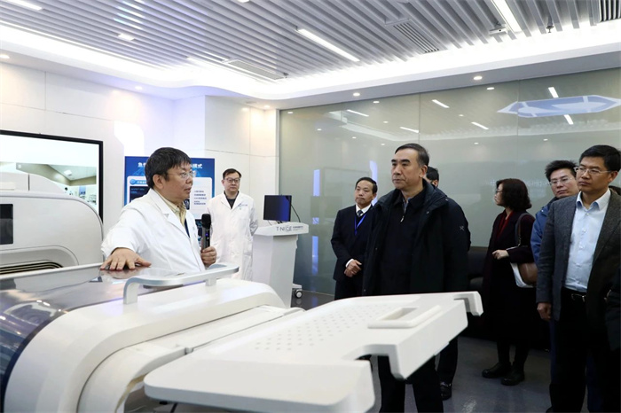 调研团一行首先来到天坛神经影像研究中心。北京天坛医院同时开展7T超高场磁共振、0.23T超低场移动磁共振和国产高端3T磁共振研究及转化应用。在这里,调研团详细了解了7T超高场磁共振、国产3T磁共振在科研、转化研究中的应用,以及基于国产0.23T超低场移动磁共振搭建的急诊卒中单元的应用情况。