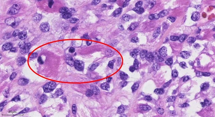 恶性蝾螈瘤是恶性周围神经鞘膜瘤的一个罕见且侵袭性的亚型,迄今为止全世界范围内报道不足百例,多为个案报道。“我作为病理科医生,这种肿瘤虽然罕见,但有明确的特异性的特征,见过就不会忘。但这毕竟是我在临床工作中第一次遇见这种肿瘤,到底准不准,我也有动摇和犹豫。”为了验证自己的判断,董格红重新调出了淼淼穿刺活检和第一次手术的病理切片,在其中寻找蛛丝马迹。