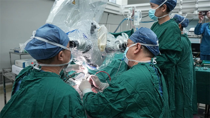 “这个肿瘤生长的位置很刁钻,位于大脑深处,颈内动脉、视神经和嗅神经的夹角,我们既要尽可能地把肿瘤切除干净,又要避免损伤神经、血管和脑组织,考验的是我们对大脑解剖结构的熟悉和显微镜下操作技术,以及手术团队的配合。”简单的交流后,在两地手术和护理团队密切配合下,手术顺利进行。