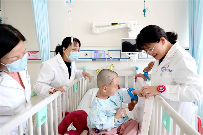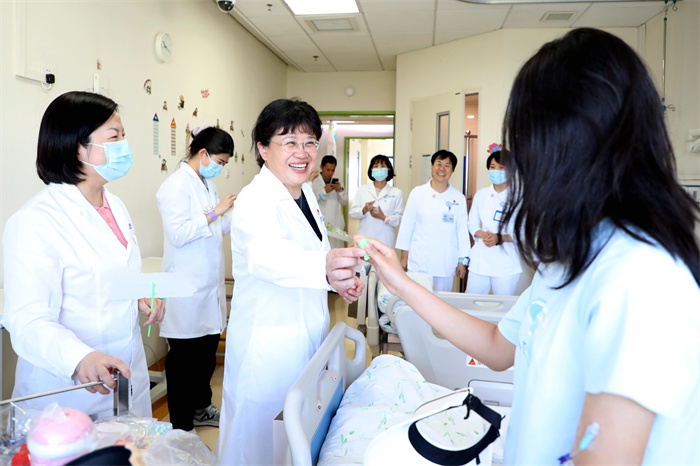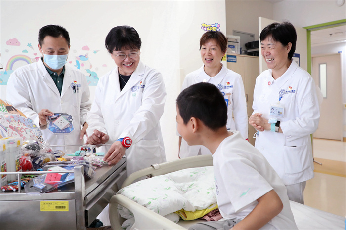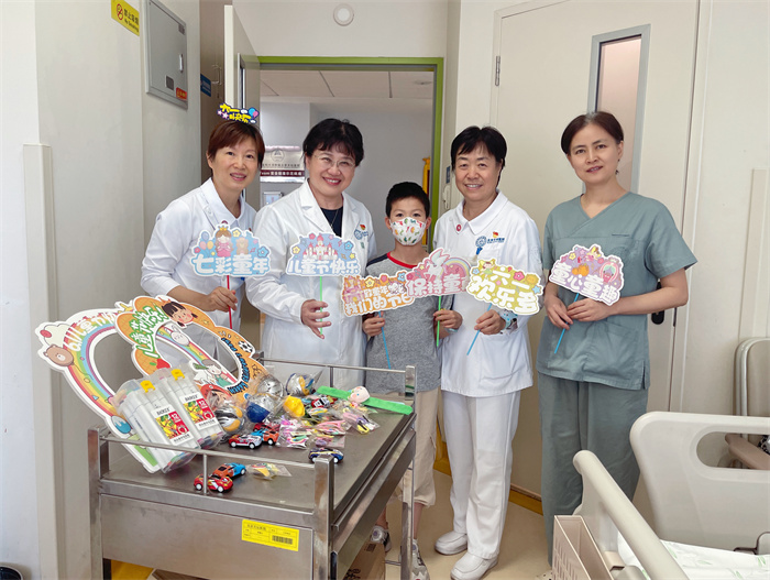 对于还在医院里的小患者来说,住院、手术让他们既紧张又害怕。为了让孩子们同样感受到节日的快乐氛围,北京天坛医院党委书记岳小林、总会计师刘菊梅、工会主席徐燕玲和护理部、手术室、院办的“大朋友”们提前准备了气球、彩旗和各种小礼物,为他们送去节日的“惊喜”。