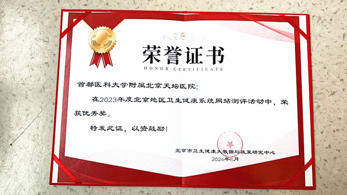 北京天坛医院官方网站在2023年度网站考核评测中获得优秀网站奖