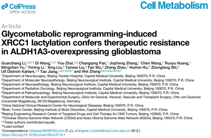 这篇题为“Glycometabolic reprogramming-mediated XRCC1 lactylation confers therapeutic resistance in high ALDH1A3-expressing glioblastomas”的研究论文由首都医科大学附属北京天坛医院主治医师李冠璋与博士研究生王地为共同第一作者,首都医科大学附属北京天坛医院神经外科学中心江涛院士与张伟教授(末位通讯)为共同通讯作者。