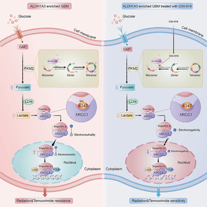 研发团队负责人、北京天坛医院神经外科学中心副主任张伟介绍,Warburg效应,即在氧气充足的条件下,糖酵解通路异常激活是胶质母细胞瘤的重要代谢特征,然而该效应如何影响胶质母细胞瘤的临床治疗以及该过程的分子调控机制尚不明确。研究团队基于中国人群脑胶质瘤基因组图谱(CGGA)数据库证实,胶质瘤干细胞重要标志物ALDH1A3表达阳性是导致胶质母细胞瘤对常规放化疗均不敏感的重要原因,并通过胶质瘤干细胞数据库及代谢组学分析,首次证实ALDH1A3通过与糖酵解限速酶PKM2互作,激活糖酵解通路并介导肿瘤细胞内乳酸堆积的分子机制。这一发现阐明了胶质母细胞瘤Warburg效应的调控机制,并且证实ALDH1A3通过异常激活糖酵解通路介导胶质母细胞瘤的放化疗抵抗。