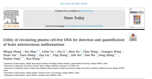 2024年8月15日,首都医科大学附属北京天坛医院神经外科杨新健、张东、王坤教授团队在《Nano Today》发表题为“Utility of circulating plasma cell-free DNA for detection and quantification of brain arteriovenous malformations”的研究论文。论文提示在脑动静脉畸形中存在的KRAS体细胞突变可以在外周血的游离DNA中被检测到,首次实现了脑动静脉畸形的“液体活检”。首都医科大学附属北京天坛医院王坤、杨新健与北京医院张东教授为论文的共同通讯作者,北京天坛医院博士后张明琦为第一作者。