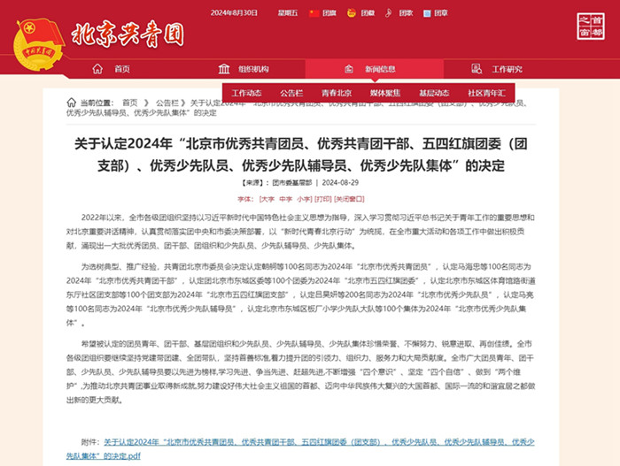 全市各级团组织坚持以习近平新时代中国特色社会主义思想为指导,深入学习贯彻习近平总书记关于青年工作的重要思想和对北京重要讲话精神,认真贯彻落实团中央和市委决策部署,以“新时代青春北京行动”为统揽,在全市重大活动和各项工作中做出积极贡献,涌现出一大批优秀团员、团干部、团组织和少先队员、少先队辅导员、少先队集体。为选树典型、推广经验,团市委认定2024年“北京市优秀共青团员、优秀共青团干部、五四红旗团委(团支部)、优秀少先队员、优秀少先队辅导员、优秀少先队集体”。