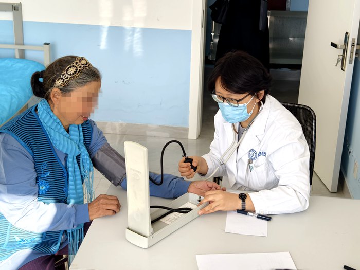 一路都是颠簸的土路,不远的路程走了一个多小时。还没到卫生院,队员们就看到往这里走的人群,顾不上休息和调整,大家迅速投入紧张的工作,问病史、查体、疾病筛查,由于语言沟通不畅,每个患者耗费的时间都远远高于平时出门诊的时间。“我们发现,很多患者住在距离卫生院几十公里外的草场,平时有不舒服的症状,只要不影响劳作,基本都是能忍就忍、能扛就扛,所以不少患者的病情比较复杂,也很重。”于是,队员们把每次看诊也作为一次健康宣教的机会,“一对一”地向患者们普及健康知识。
