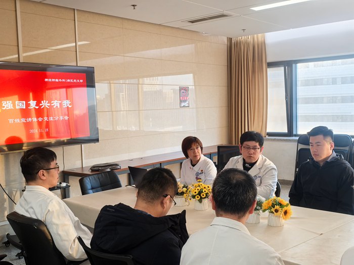 为深入学习贯彻习近平新时代中国特色社会主义思想和党的二十大、二十届三中全会精神,激发党员干部爱岗敬业、锐意进取的精神,北京市百姓宣讲工作领导小组办公室与北京市卫生健康委员会共同举办《北京市“强国复兴有我”百姓宣讲云直播》学习活动,在院党委的部署下,神经外科肿瘤1病区党支部组织党员观看学习,并于2024年11月18日召开“强国复兴有我”百姓宣讲体会交流主题党日活动。