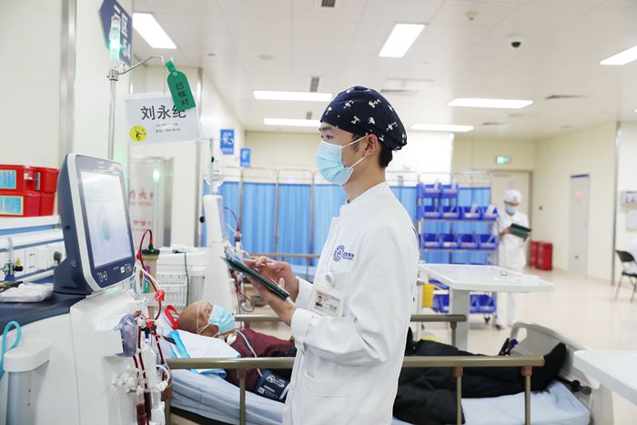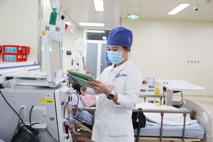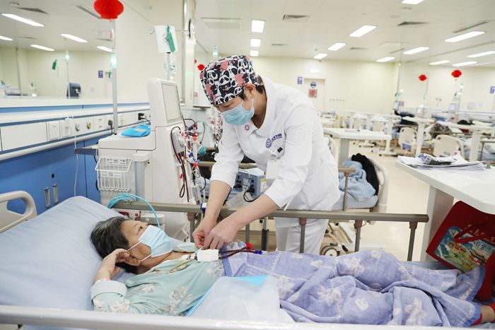 血液透析是尿毒症患者的“生命”,春节期间,如同不停运转的血透机器,北京天坛医院肾内科血液净化中心的医务人员也时刻保持“在线”状态,依旧在工作岗位上奔波忙碌,他们忙碌的身影构成了一道独特而温暖的风景线。