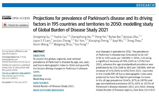 北京天坛医院冯涛教授团队建模研究在BMJ发表:预测到2050年全球帕金森病流行病学趋势