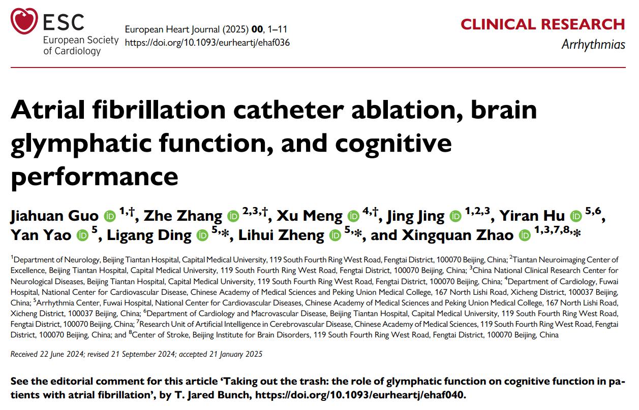 天坛、阜外团队联合 首次揭示心房颤动及导管消融治疗对大脑类淋巴功能的潜在影响及其与认知功能的关联