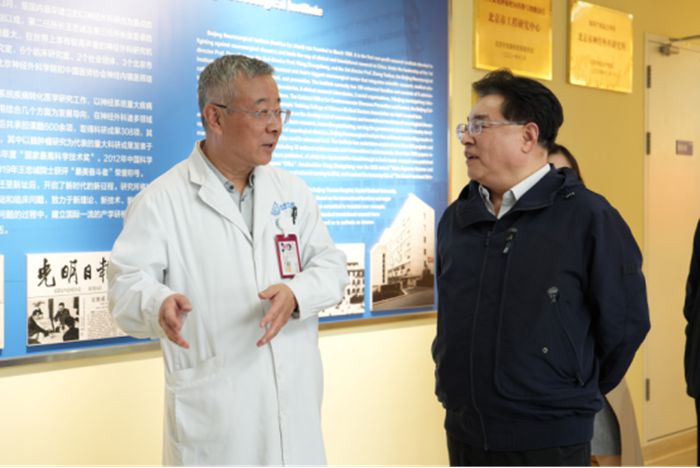 党员们首先参观了天坛神经影像中心、神经疾病人工智能研究中心及北京市神经外科研究所所史馆等,从编撰首部《脑血管造影术》打破技术壁垒,到显微神经外科技术突破“手术禁区”,再到自主研发脑胶质瘤靶向药伯瑞替尼,通过研究所的历史,感受中国神经外科从跟跑到领跑的跨越式发展,以及以王忠诚院士为代表的“天坛人”人民至上、勇于攀登的精神。