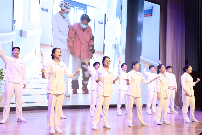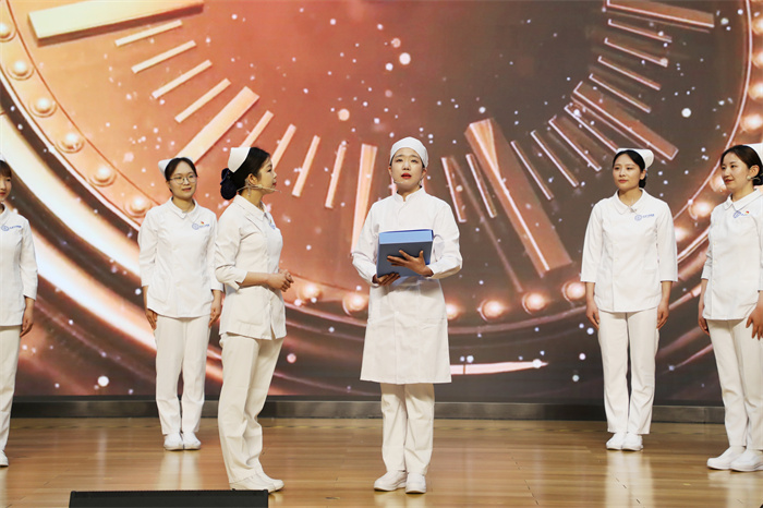 随后,护士们带来《康复操活力串烧秀》、情景剧《跨越时空的守护》等精彩的表演,特别是在情景剧中,通过两代护理人跨越时空的对话,展现了护理事业的传承和创新,以及一代代护理人无私奉献的精神。