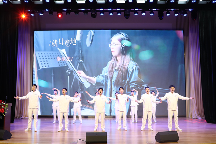 一曲由护士们自编自演的歌曲《篇章》拉开大会序幕,激昂的歌曲中,大屏幕上播放起各个岗位的护士全力以赴投入工作的身影。