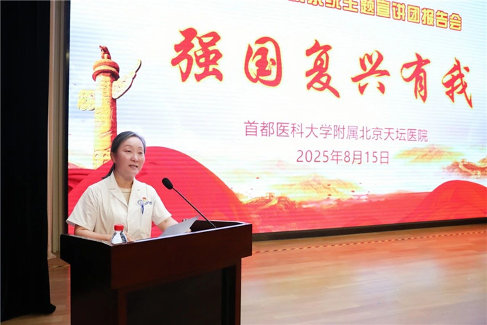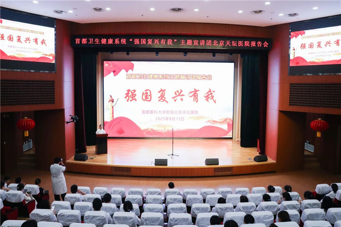2025年8月15日下午,首都卫生健康系统“强国复兴有我”主题宣讲团北京天坛医院报告会在忠诚楼报告厅举行。来自首都卫生健康系统不同岗位的10位宣讲员,从不同角度和侧面展示首都卫生健康工作者的责任和担当。