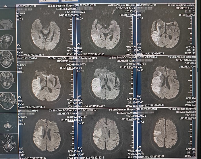8月2日上午,来自昆明的游客周先生突然出现头痛头晕、左侧肢体无力、言语含糊的症状,中午12时许,他被120送到玉树州人民医院。“我们第一时间启动卒中绿色通道,对患者的情况进行全面评估。”北京第六批第一期援青医疗团成员,玉树州人民医院卒中中心(神经内科)和介入科主任佟旭说,评估发现周先生言语含糊,左侧肢体肌力显著下降(上肢2级、下肢3级),头颅CT确诊为“右侧大脑半球急性脑梗死”,NIHSS评分高达12分(分数越高,说明神经受损越严重)。