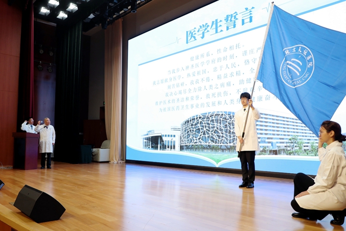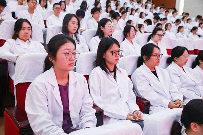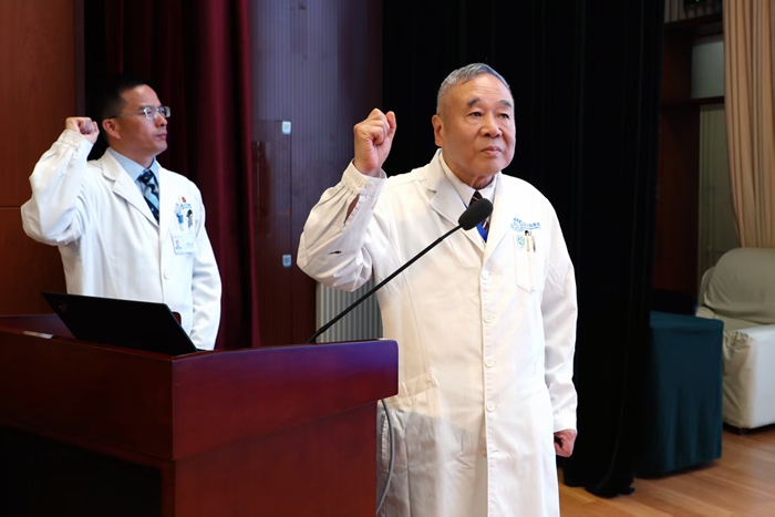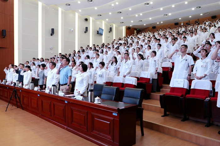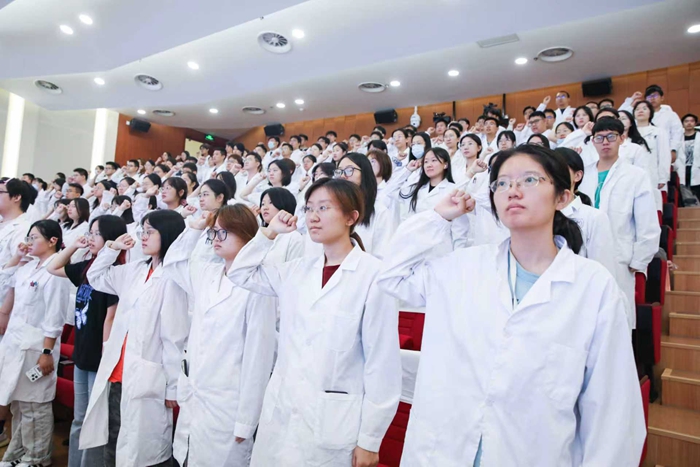 开学典礼上,全体师生肃立迎接医院院旗。在赵继宗院士的带领下,全体参会人员高举右拳,重温医学生誓言。“健康所系,性命相托……”铿锵有力的誓言萦绕在报告厅内,每一位新生的心灵再一次受到洗礼。