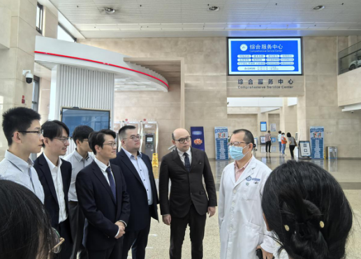 上午9时,代表团对北京天坛医院门诊运行情况展开实地考察。在门诊服务中心,杨洋向代表团重点介绍了医院“以患者为中心”的诊疗服务模式与整体流程。代表团体验了将预约、取号、复诊等多项患者服务整合于一体的“一站式”服务流程,切身感受到高效集约的服务设计为患者带来的便利。随后,代表团来到门诊药房区域,现场观摩现代化智能发药系统的实际运作,对北京天坛医院在药学服务信息化、规范化、便捷化方面的工作有了更深入的了解。
