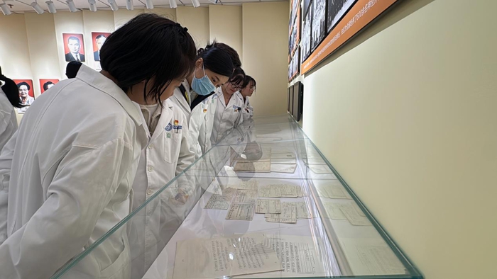 步入展室,那些泛黄的手稿、质朴的办公旧物、珍贵的历史影像随着生动的讲解在方寸之间汇聚成一部立体的史诗——不仅记录着一位医学巨匠从青年立志到奠基立业的奋斗人生,更折射出中国神经外科事业从无到有、从弱到强的壮阔历程。展板上翔实的图片和数据,无一不在无声诠释着“生命禁区”如何被一步步突破;而展柜中的白衣和编号001的工牌,又默默诉说着奉献与坚守的温度。
