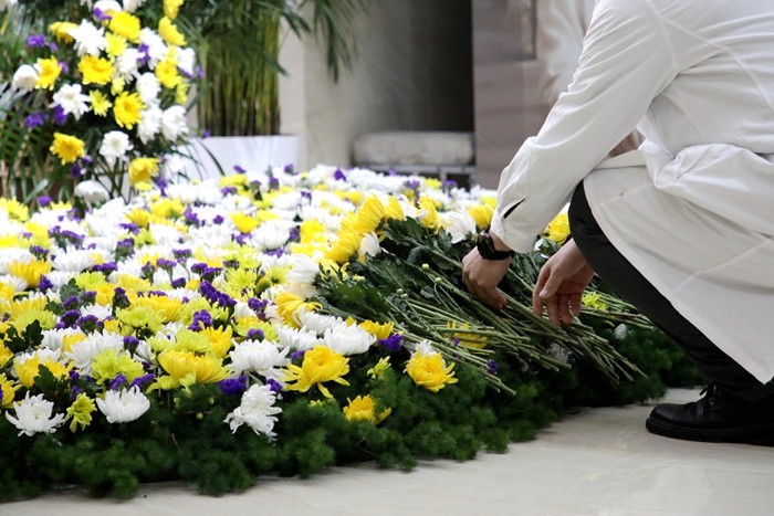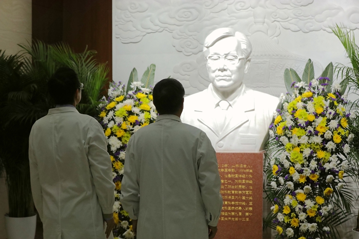7时30分,来自北京天坛医院和北京市神经外科研究所的100余名医务人员代表,在医院领导班子的带领下,来到以王忠诚院士名字命名的“忠诚楼”,举行简朴而庄重的献花仪式。仪式由北京天坛医院党委副书记贾旺主持,全体参加人员身着白衣,整齐肃立,迎着朝阳向王忠诚院士塑像深深鞠躬,并献上代表追思和怀念的鲜花,以表达对这位医学巨匠的无尽怀念和崇高敬意。