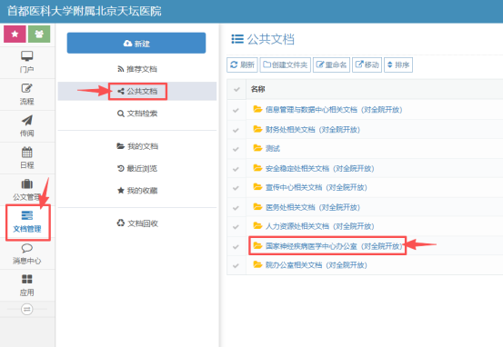 申报材料下载需登录医院OA系统,左侧栏目点击“文档管理”-“公共文档”,点击“国家神经疾病医学中心办公室”文件夹,内有对应申报材料可供下载。