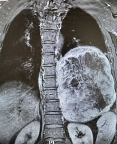 家中“顶梁柱”的杜先生,两个月前,左侧卧位时频繁出现心慌、胸痛等症状,当地医院检查后发现,其左后纵隔-胸腔内存在巨大占位性病变。进一步穿刺活检提示为“梭型细胞瘤,结合免疫组化考虑神经鞘瘤”,当地医院虽为其进行了射频消融治疗,暂时缓解了症状,但因肿瘤体积过大、位置特殊,手术切除难度极高,无法开展根治性治疗。