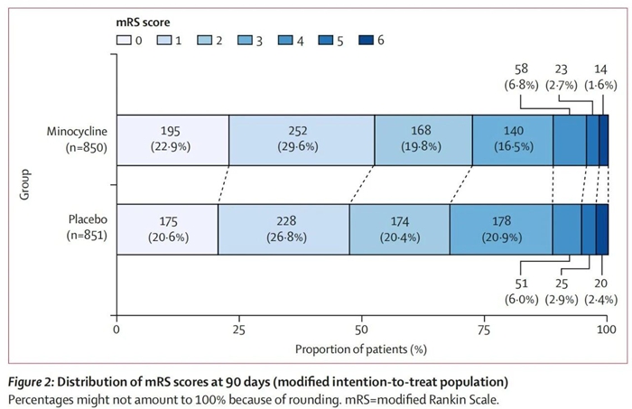 研究结果显示,与安慰剂组相比,米诺环素治疗可显著提高患者90天良好功能预后及功能独立的比例,且米诺环素组患者整体功能障碍程度明显减轻。在随机化6天时,米诺环素组患者的神经功能缺损改善幅度显著优于安慰剂组。在安全性方面,两组在症状性颅内出血、严重不良事件等安全性结局的发生率方面均未观察到显著差异,提示短程口服米诺环素治疗具有良好的安全性。