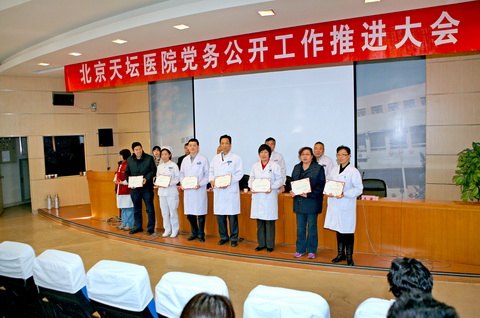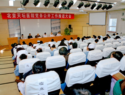 院长、党委副书记王晨同志宣读了《北京天坛医院推进党的基层组织实行党务公开工作实施方案》,强调了党务公开的内容和任务分工、公开范围和形式、公开时限及程序。会上成立了党务公开工作领导小组,由党委书记宋茂民同志担任组长,领导小组办公室设在党委办公室。宋茂民书记代表院党委做了《北京天坛医院2011年党务公开工作报告》,对医院中心工作、宣传思想工作、组织人事工作、党风廉政建设工作等方面的有关情况进行公开。