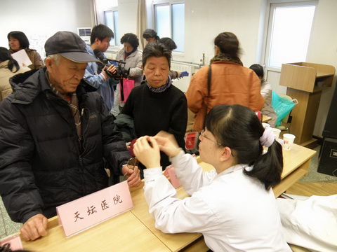 “血压110/70,您的血压保持得非常好”,这是北京天坛医院市级青年文明号号长王颖同志在龙潭街道办事处的会议室里耐心地为每一位居民测量着血压。70多岁的老人家,接受着天坛医院医师们的详细检查。