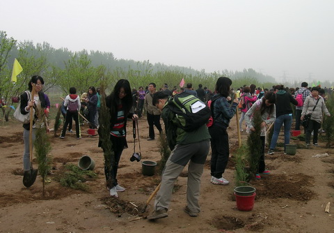 经过一个半小时的车程,终于到达田边。浩大的职工队伍在北京天坛医院院旗指引下进入植树基地。三个人一组,挖坑、提水、植树苗,大家干得热火朝天。不少年轻职工还是第一次拿铁锹,但一样干得非常起劲。一棵棵小松树不一会就在林地旁整齐地站立起来。面对自己的劳动成果,大家都显得很是自豪,争抢着在自己植下的小树旁、院旗下摄影留念——“我们为首都增添绿色做了贡献!”