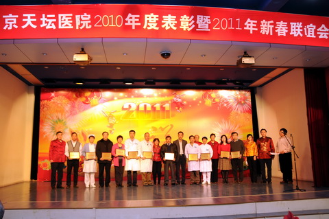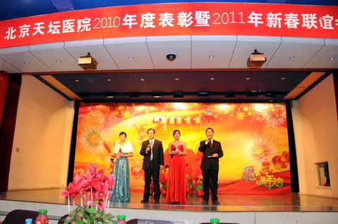 王拥军副院长主持了2010年度总结表彰,王晨院长等院领导分别宣读了2010年度获得先进科室、先进分会、先进团支部和先进工作者、优秀干部名单。王晨院长代表院领导致新年贺词。他说,今天我们欢聚一堂,隆重召开2010年度表彰暨2011年新春联谊会。在过去的一年,医院在医、教、研、防、管理等方面取得了骄人的成绩。这是全院干部、职工奋力拼搏的结果,我代表院领导班子,向全院的干部职工表示感谢,向获得各荣誉称号的先进集体、先进个人表示祝贺。在辞旧迎新、新春佳节来临之际,我们向在座的老干部、老专家、科主任、党支部书记、护士长、工会主席、团支部书记祝贺新春,并通过大家给全院职工拜年,祝大家春节愉快、身体健康、阖家幸福、万事如意!王院长的致辞博得全场热烈的掌声。