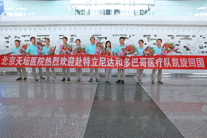7月24日下午4点,我国第二批援特立尼达和多巴哥医疗队圆满完成医疗任务,顺利返回北京。北京市卫计委国际合作处处长鲍华、首都医科大学附属北京天坛医院院长王晨、书记宋茂民等领导及与医务人员代表30余人到机场迎接。
