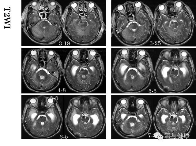 患者急性期共完成高压氧治疗20余次,鉴于4月8日脑核磁显示双侧脑室开始扩大,室旁周围出现渗出性改变,考虑为出血后继发颅内交通性脑积水。择时给予脑室腹腔分流术,术后继续间断高压氧治疗。7月30日复查脑核磁显示:脑室周围渗出消失。