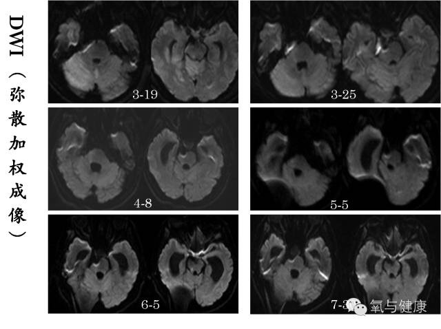 2014年3月12日下午5:20,北京天坛医院,一位男性患者,43岁,因突然出现昏迷,呼吸暂停正在紧急抢救。经紧急气管插管,呼吸机支持等抢救措施,待生命体征平稳后,急诊脑CT检查,确诊为颅内蛛网膜下腔出血,考虑动脉瘤破裂。于19:21分行脑血管介入造影,确诊为基底动脉尖夹层瘤破裂,并行动脉栓塞术。术后自主呼吸恢复,但仍呈浅昏迷状态,随后转入重症监护病房监护治疗,同时进行脑室和腰穿引流,颅内压监测。3月16日(术后第四天)患者昏迷状态加重,医院组织神经外科、神经内科、神经介入科、神经ICU和高压氧科等有关专家紧急会诊。经专家讨论认为再出血可能性很小,除加强监护治疗外,应尽早高压氧治疗。鉴于患者随后两日昏迷进行性加重,3月19日脑核磁影像发现右侧中脑、桥脑和小脑引部和半球广泛急性缺血改变,为挽救患者缺血区脑组织,改善脑干功能,随紧急于当日采用高压氧舱内抢救治疗。高压氧首次治疗后次日患者意识即出现明显好转,随后每次治疗后均有明显改善,后经经高压氧连续治疗6次后神志完全清醒,3月25日、4月8日及5月份脑核磁影像检查原脑缺血范围和程度明显好转(详见核磁影像对比)