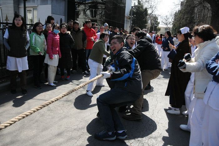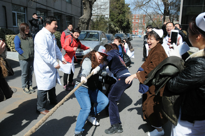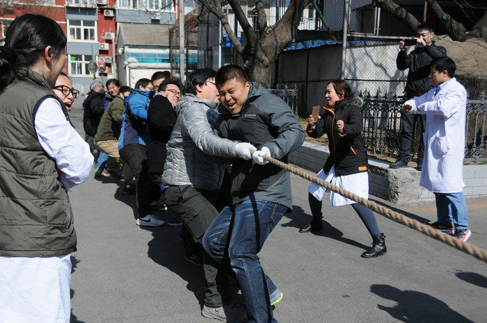 “哔”,随着一声哨响,2016年北京天坛医院迎“三•八”全民健身活动之拔河比赛于3月9日中午在院区内拉开序幕。此次比赛共有男子18、女子22支队伍参赛,每队10人。比赛以一局定胜负,淘汰制的方式,实行抽签分组比赛。比赛过程精彩纷呈,参赛队伍斗志昂扬、奋力拼搏,啦啦队助威声呐喊声此起彼伏,声势振人,现场气氛紧张热烈。最终神经外科、神经内科、外科、研究所、药学部以领先的优势获得男子组优胜,神经外科、外科、检验病理、手术室1队、ICU1、ICU2队以微弱的差距获得女子组优胜。