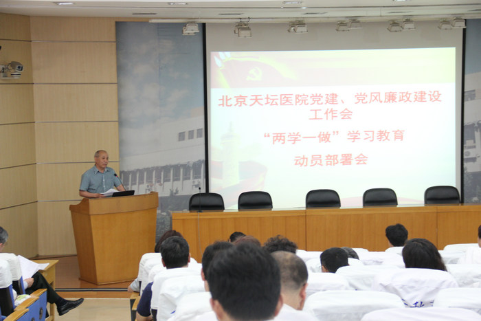 院长、党委副书记王晨宣读了《中共北京天坛医院委员会“两学一做”学习教育工作方案》,继向党委委员、党支部书记传达部署后,在全院进行部署。王晨院长强调“两学一做”学习教育是面向全体党员开展的学习教育,基础在学,关键在做。每位党员都要高度重视,在学党章党规、学系列讲话的基础上,以知促行,做“讲政治、有信念,讲规矩、有纪律,讲道德、有品行,讲奉献、有作为”的“四讲四有”合格党员。每个党支部要切实履行主体责任,坚持围绕中心、服务大局,按要求开展专题学习讨论、讲党课、召开专题组织生活会、开展民主评议党员、组织党员活动等。