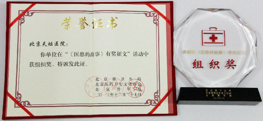 1月15日,北京医药卫生文化协会年会暨《医患的故事》医学人文有奖征文颁奖典礼在首都医科大学举行,我院荣获2013年首都医药卫生文化建设先进单位,获征文比赛组织奖。匡远深、苏娅丽撰写的征文《白雪公主的最后签名:我想重生》斩获征文特等奖,姜悦撰写的《打了一场医政管理的生命争夺战》获三等奖。