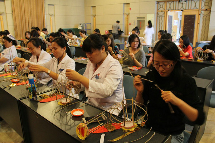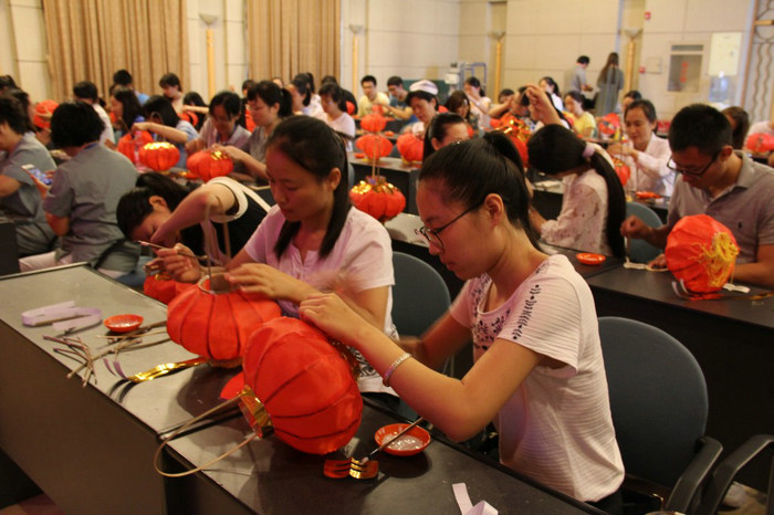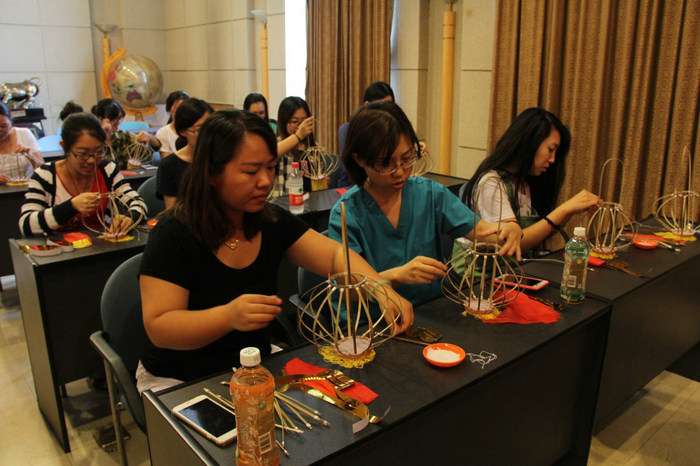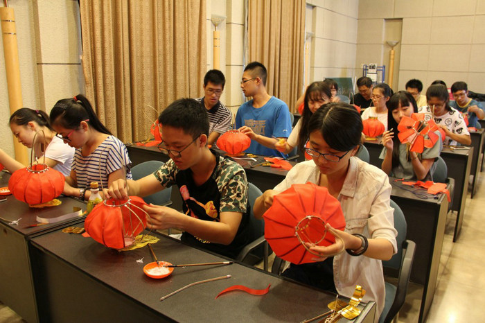 台下的青年们听得专注,早已跃跃欲试。在老师的指导下,大家小心翼翼地用一根根竹条搭起灯架子,仔细刷上乳胶、贴上红尼龙稠、修剪多余布片,经过多道工序的重复之后初具雏形,最后装饰上“银头”、“金条”,终于大功告成!一个个红彤彤的灯笼显得格外喜庆,将会场装点得节日韵味十足。看着自己的劳动成果,大伙儿笑颜逐开,纷纷拍照留念,并表示活动很有意义!