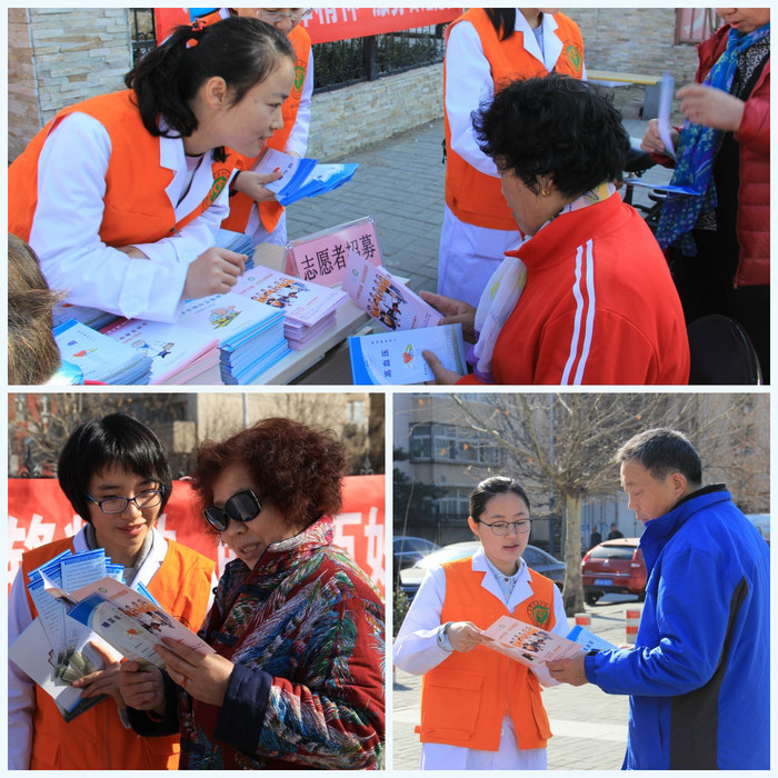 春寒料峭,尽管这天的风有点大,气温略有点低,但志愿者们的热情依旧高涨。在银地社区文化大广场上,身着“守护天使”马甲的志愿者们刚一亮相便成了焦点,不一会儿前来咨询的居民已排起了队。还没顾上喝口热水暖和一下,大家便各就各位忙活儿起来。神经内科吴建维、内科方红娟、外科杨皛皛、中医科李康宁等四位青年医生耐心问诊,热忱地为居民答疑解惑;来自学生团总支的7名医学生志愿者干劲十足,有的忙着量血压,有的派发健康科普宣教材料,有的宣传招募门诊导医志愿者。