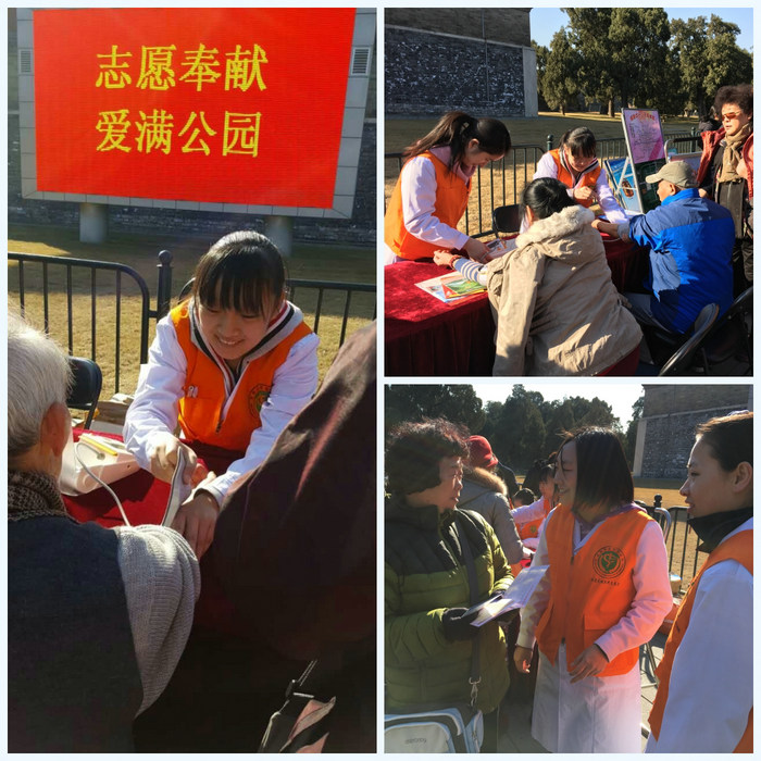 在社区义诊活动火热进行的同时,院团委派出的另一支志愿者小分队进驻天坛公园,与公园团委一起开展“志愿奉献 爱满公园”主题活动。4名医学生志愿者热心地为游客测量血压,开展慢病科普知识宣传,受到游客们的交头称赞。