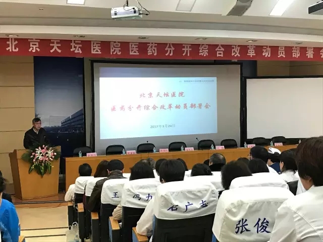 3月24日上午8点,北京天坛医院在教学楼阶梯教室召开了医药分开综合改革动员部署会,王晨院长主持会议,王拥军副院长作了医药分开综合改革具体工作部署;神经外科王硕教授、外科党支部书记、乳腺科王丕琳主任以及信息中心王韬主任分别代表医护人员及本科室表态,坚决支持北京医改这项伟大工程,用实际行动全力做好本职工作。院党委书记宋茂民进行了动员,重点强调“统一思想,统一步调,遵守纪律,并坚决贯彻执行”。全院中层干部及党支部书记、护士长参会。(宣传中心 匡远深)