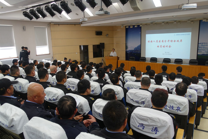3月28日下午,保卫处召开保安人员医药分开综合改革动员培训会,共有3家外包服务公司的90余保安人员(治安保安、值机保安、车场工作人员)参加培训。