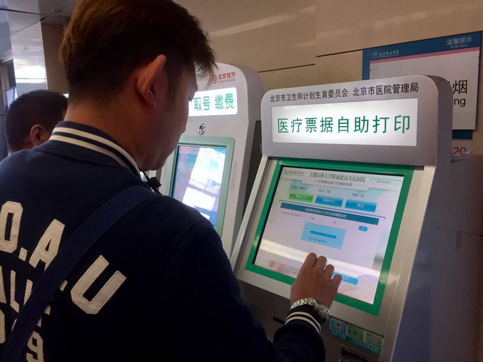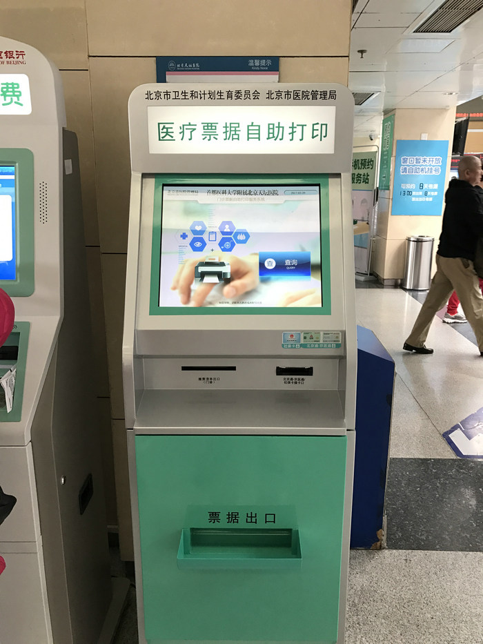 我院在门诊大厅设置了医疗票据自助打印机,患者持医保卡或京医通卡,可以按月查询到近一年未打印票据信息,并进行相应票据打印以及清单补打操作。票据自助打印机的设置使得患者无需在窗口排队,在自助机就能完成自助挂号、自助取号、自助缴费、自助打印票据一系列完整的门诊自助操作,切实方便了患者的使用。