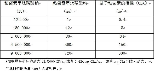 药品的剂量应该一直用粘菌素甲烷磺酸钠IU表示。欧盟和其他地区(例如美国和澳大利亚)粘菌素甲烷磺酸钠和粘菌素规格的单位不同,这会导致医学文献报告错误,也可能导致严重用药错误,为了解决这项差异,推荐在产品信息中补充下表: