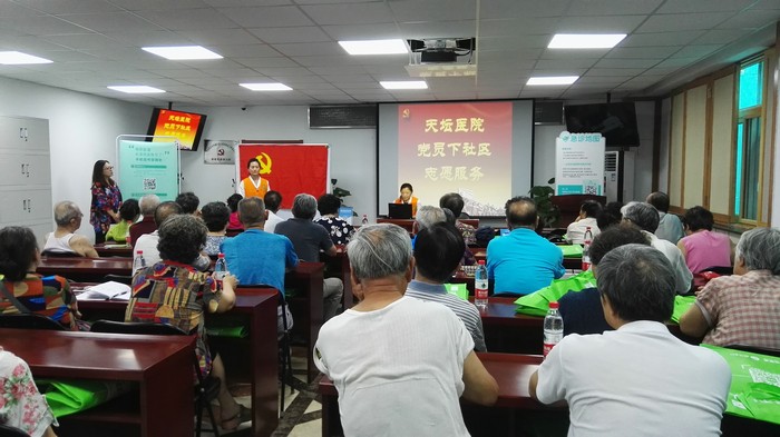 2017年7月11日,天坛医院研究所党总支与医政党支部、京医通联合开展“党员进社区志愿服务”活动。研究所党总支翟晶书记带队走进右内西街社区服务站,社区内的五十余名居民参加了此次活动。