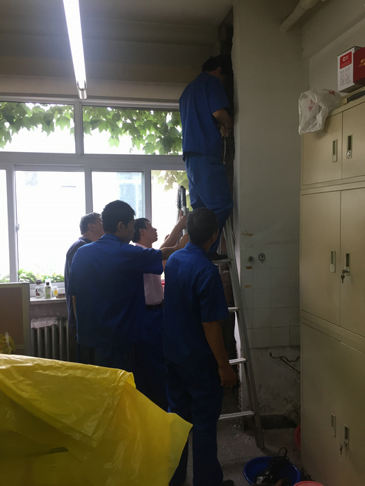 总务处维修班立即前往勘察,在班长贾宏旗和王耀华带队下,维修班的师傅们顾不上高温和污浊的空气,多次钻进设备层勘察。由于设备层中的管路错综复杂,而且漏水点不明确,经过几天全方位的仔细排查,终于找出了漏水原因。为不影响科研人员的正常工作,贾宏旗班长带领管道工、瓦工、木工等10人放弃休息,利用周末冒着高温酷暑,对破裂的管道进行修缮。为了能用最小的拆除面积解决问题,师傅们进行了仔细的测算,拆除了室内管道井一侧井壁,在管道林立、目视不明的狭小空间里,清理出仅容伸入手臂作业的范围。维修师傅踩着高梯趴在井壁上,伸入双手娴熟的对管道进行清污除锈、封堵裂缝、缠绕包裹,经过近5个小时奋战,彻底修复了破裂的管道和存在隐患的管道,此时所有人员的衣服早已被汗水浸湿。在短暂休息后,他们将管道井壁进行恢复,还帮忙把办公室清扫干净。