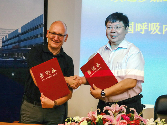 在本次学习班上,来自德国海德堡大学附属胸科医院的国际著名呼吸介入专家,同时也是该院的执行院长Felix JF Herth教授与北京天坛医院王拥军院长互相签署了两家医院的战略合作协议,将共同建设天坛医院-海德堡胸科医院呼吸内镜介入技术培训中心,为中国培养更多的呼吸内镜介入人才。同时Herth教授还向北京天坛医院呼吸内科主任张杰教授颁发了海德堡胸科医院的客座教授聘书,聘请张杰教授担任海德堡胸科医院的客座教授,这也是对张杰教授所代表的中国呼吸介入专家技术水平的肯定。