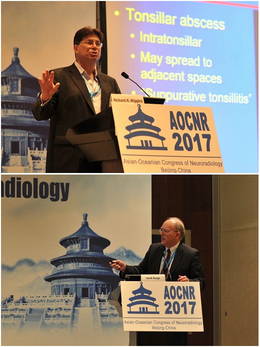 Plenary Session主要讲授神经与头颈部疾病的基础知识及临床内容,课程受众面广泛,临床应用性强。来自美国哈佛医学院麻省眼耳科医院的Hugh D. Curtin教授,加拿大多伦多大学医学影像科Walter Kucharczyk教授,美国犹他大学健康科学中心放射科Richard H. Wiggins教授,瑞士苏黎世大学核医学科Gustav von Schulthess教授,美国密歇根州立大学放射科Suresh K. Mukherji教授和中国四川大学华西医院放射科龚启勇教授分别进行了精彩的授课。Educational Course Session采用30分钟时长的课程形式对神经与头颈部各专业领域内容进行讲授与讨论,包括神经系统肿瘤(共8节课程)、神经退行性疾病(共6节课程)、脑血管疾病(共8节课程)、头颈部疾病(共13节课程)、儿童神经系统疾病(共3节课程)、脊髓与脊柱疾病(共2节课程)、脱髓鞘与炎症病变(共3节课程)七大板块。此外,Scientific Session设置了脑与脊髓专场和脑血管病专场,通过对来稿进行严格筛选,最后共有16位讲者受邀发言并进行了精彩的口头汇报。