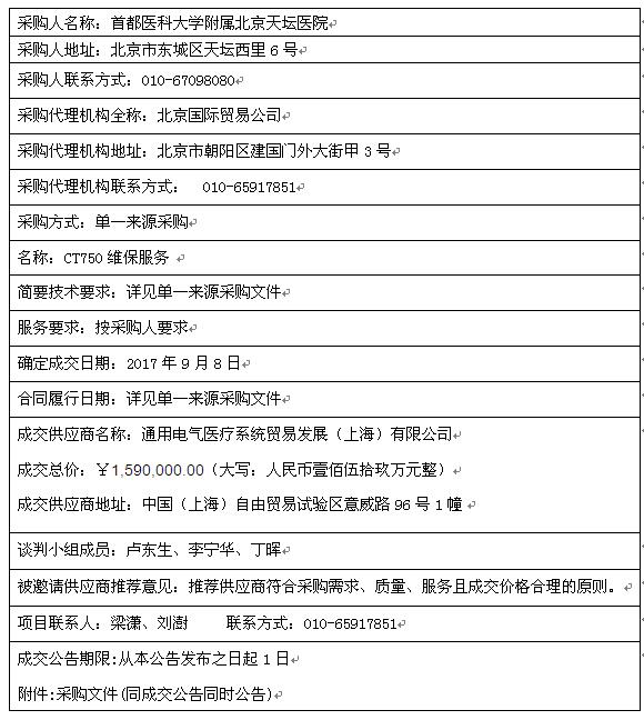 北京天坛医院CT750维保服务项目成交公告【编号:0686-1741C353495Z】