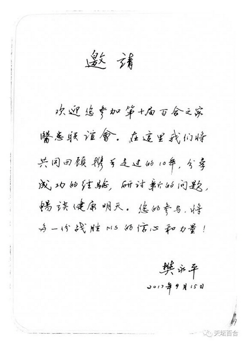2008年9月第一届多发性硬化医患联谊会——“百合之家”正式启动。“百合之家”寓意深刻,花朵百合高贵纯洁、百事合意,中药百合甘凉清润、宁心安神,又是治疗该病的一味良药。百合之家,满载着对患者的美好祝愿。从2008年到2017年,“百合之家”陪伴广大患友们走过了十年,成为每年中医科的重要活动之一,我们希望在医患之间、患者与患者之间搭建一个互相交流、学习的平台,为患友们答疑解惑,为患友及家属们传递最新的诊疗进展,患友之间也可以借助这个平台互相鼓励、交流经验、共同面对疾病。正如樊永平主任在邀请函中所写的“在这里我们将共同回顾携手走过的十年,分享成功的经验,研讨新的问题,畅谈健康明天。您的参与,将多一份战胜MS的信心和力量”。