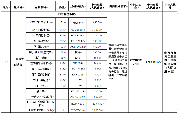 北京天坛医院新院迁建工程信息化建设(一期)- 一卡通管理系统中标公告【编号:0701-174160100257】